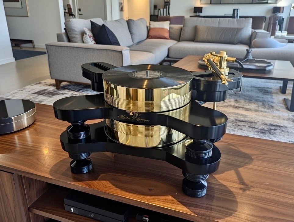 Our Master Reference turntable increases rigidity, vibration isolation, and soundstage by adding even more metal. Structural support is greatly enhanced by a pair of one-inch proprietary alloy decks suspending twin 3-inch platters, each made of our special alloy formulated in house. Using double decks and double platters architecturally isolates the high-torque motor from the cartridge. This combination sets a huge, airy soundstage filled with precise, articulate dynamics against a dead quiet, velvety black background. Bass becomes tighter, with mid-range and treble becoming more refined. Instruments are now tightly focused and as clear as stars in the night sky. Inner details flow willingly from the record groove with astounding dynamics and ultra-fast transients. The Master Reference is equipped with two armboards for installing two tonearms simultaneously. Crystal digital controllers provide the ultimate in platter speed control at either 33 1/3rd or 45 RPM.